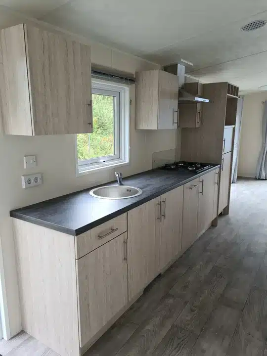 O design da Casa Móvel Pré-fabricada T3 TerraLuz é projetado para otimizar cada centímetro do espaço. Sua planta é inteligente e funcional, garantindo que cada cômodo seja bem aproveitado. Os dois quartos são confortáveis e oferecem espaço suficiente para até quatro camas, tornando a casa ideal para pequenas famílias ou para quem precisa de um espaço extra para hóspedes. A cozinha totalmente equipada permite que você prepare suas refeições com praticidade e facilidade, enquanto o banheiro completo oferece todo o conforto necessário.